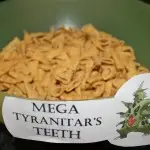 Mega Tyranitar has two sets of sharp, pointed teeth…. which makes Bugles the perfect treat for this Pokémon! I just dumped a bag of Bugles into a bowl, taped the label to it… and done!