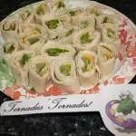Anyway, my pinwheels are easy to make. I spread a thin amount of sauce (ranch dressing, sweet onion sauce, honey mustard… whatever sounds good) over a tortilla. I put two or three pieces of lunchmeat down the middle, add a few slices of cheese, some lettuce and wrap it up. Then I cut the roll into slices. That’s it!